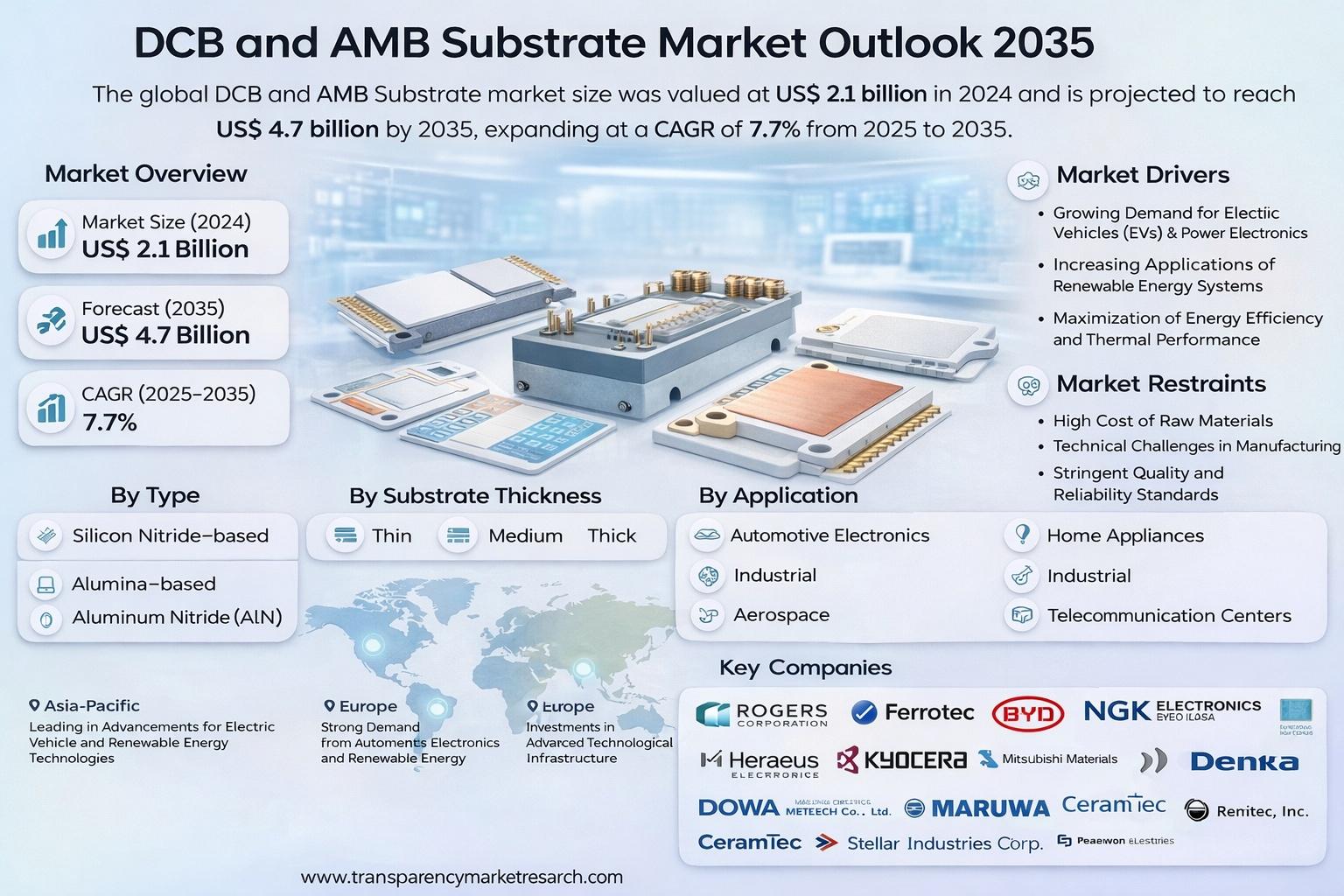 The global DCB and AMB substrate market is gaining strong momentum as industries accelerate toward electrification, energy efficiency, and high-performance power electronics. Valued at US$ 2.1 billion in 2024, the market is projected to reach US$ 4.7 billion by 2035, expanding at a robust CAGR of 7.7% from 2025 to 2035. This rapid growth underscores the critical role that Direct Copper Bonded (DCB) and Active Metal Brazed (AMB) substrates play in managing heat, voltage, and reliability in modern power systems.