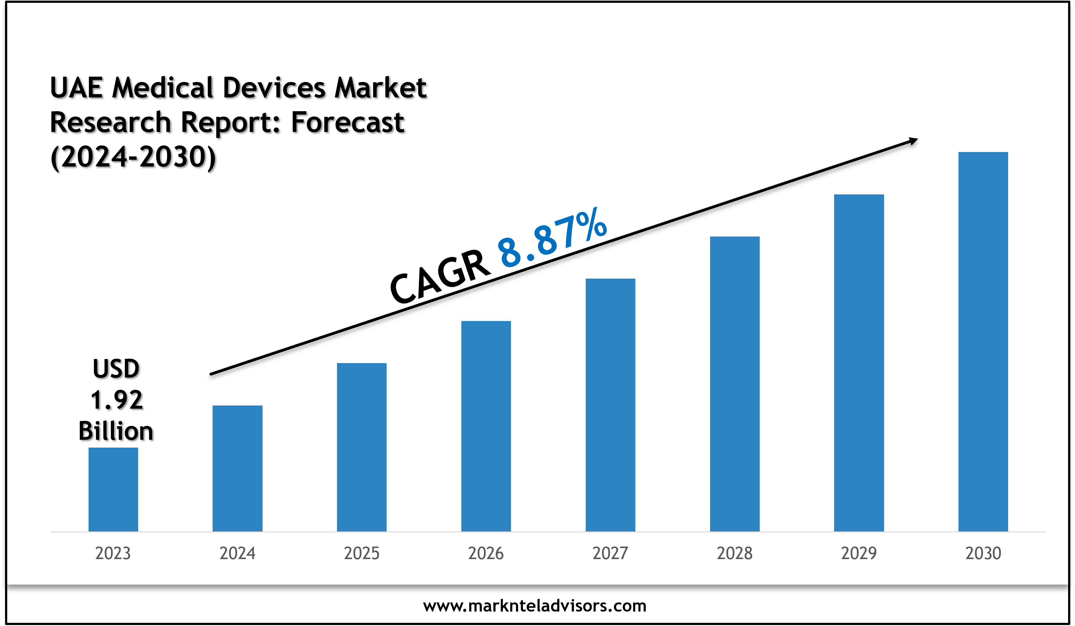The UAE Medical Device Market size was valued at around USD 1.92 billion in 2023 and is estimated to grow at a CAGR of about 8.87% during the forecast period, i.e., 2024-30. This is largely attributed to the country's commitment to providing world-class healthcare services, strategic location as a regional healthcare hub, and a healthcare ecosystem marked by cutting-edge technology and skilled healthcare professionals. The surging demand for innovative new devices and the growing prevalence of lifestyle & chronic diseases such as obesity & diabetes is also aiding in elevating the demand for these devices across the medical sector.