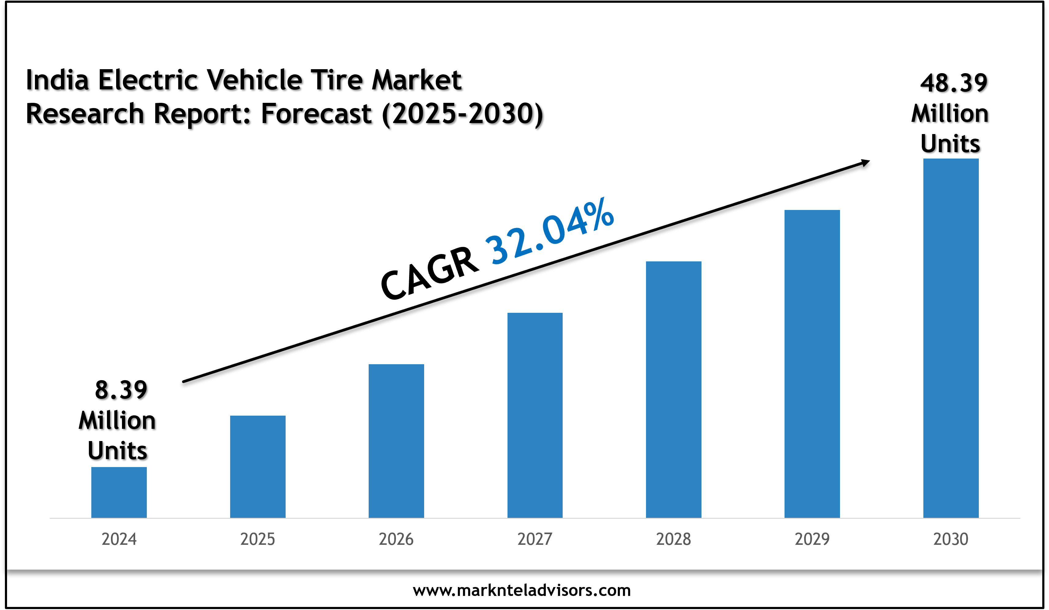 India Electric Vehicle Tire Market size was valued at around 8.39 Million Units in 2024 and is projected to reach 48.39 Million Units by 2030. Along with this, the market is estimated to grow at a CAGR of around 32.04% during the forecast period, i.e., 2025-30. The market is driven by the rapidly increasing concerns over environmental degradation, excessive use of fossil fuels, and mounting emissions, leading to several health issues while challenging sustainability.