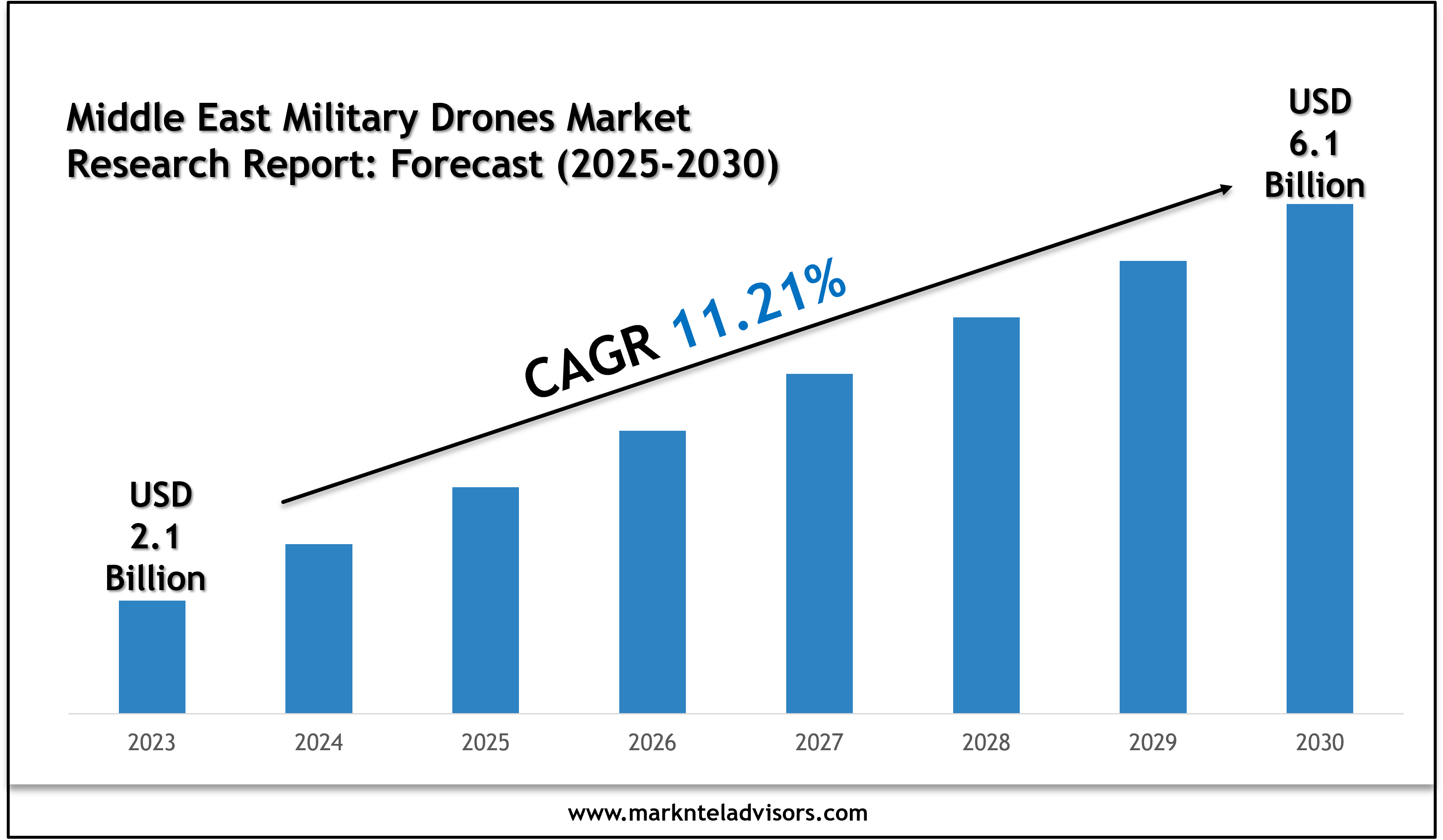 The Middle East Military Drones Market size is valued at around USD 2.1 billion in 2023 & is projected to reach USD 6.1 billion by 2030. The market is also estimated to grow at a CAGR of around 11.21% during the forecast period, i.e., 2025-2030. The growth of the market is driven primarily by the rapidly increasing demand for technologically advanced defense systems by different countries across the Middle East, i.e., soaring the need for military drones in applications like surveillance, transportation, monitoring, mapping, & combat operations. Besides, the swiftly increasing defense budgets and government encouragement for the production and distribution of military drones are also driving the market.