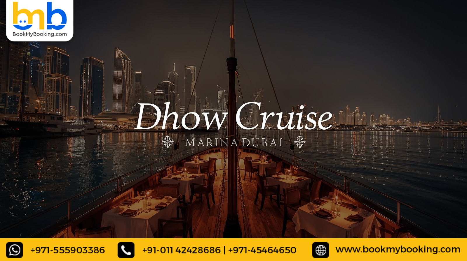 Book your Dhow Cruise Marina tickets online with BookMyBooking, the trusted platform for Hotels, Holiday Packages, and Tour Activities. Discover the charm of Dhow Cruise Marina, check Dhow Cruise Marina prices and Dhow Cruise Marina timings, and enjoy breathtaking views of Dubai Marina, live entertainment, and a lavish buffet dinner onboard a traditional dhow.
