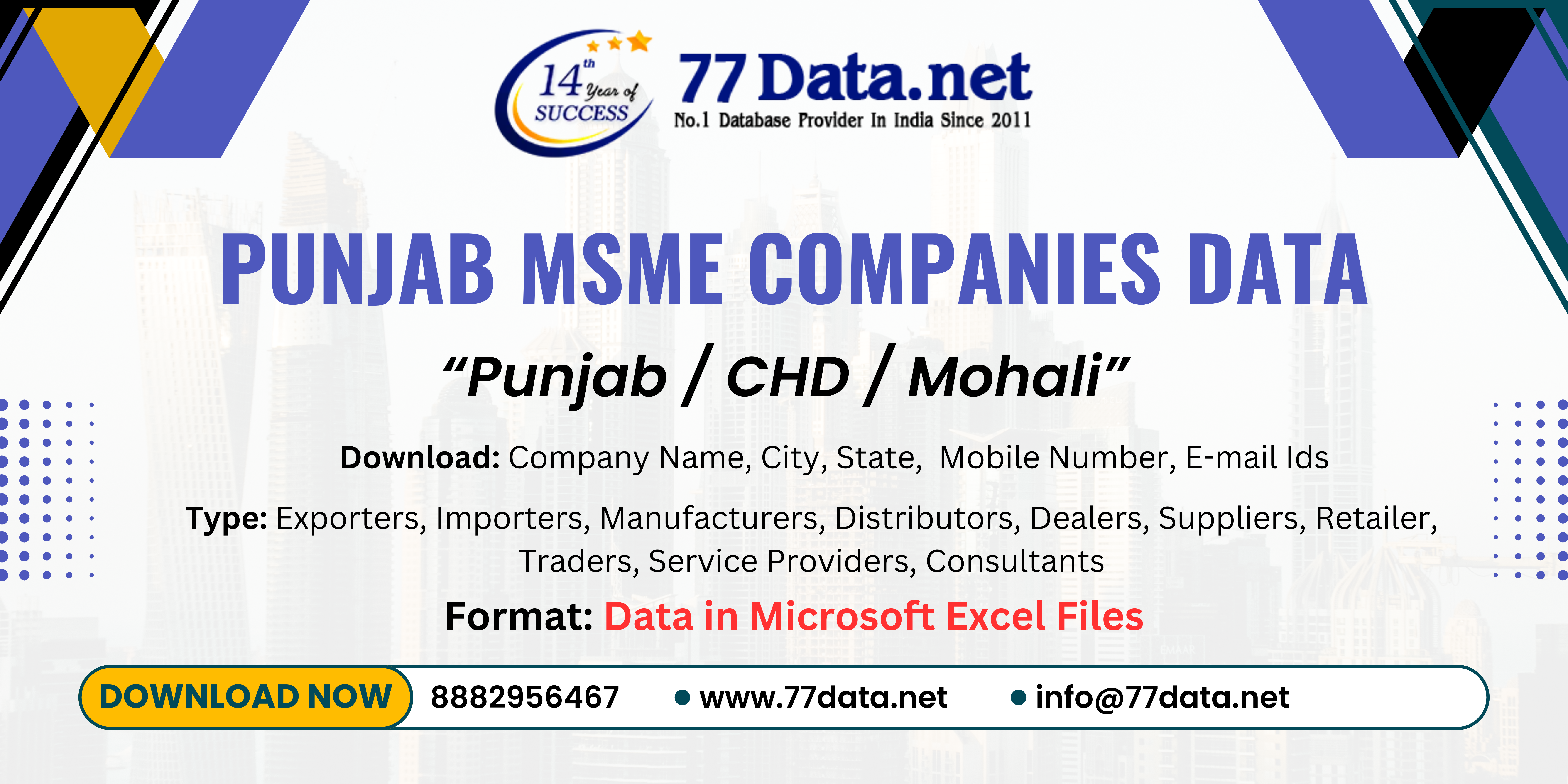 Download the list of MSME companies in Punjab with contact details. All SMEs, MSMEs and manufacturing companies' data in Excel format. The data contains all kinds of business details like mobile numbers, emails, company names, services and product details. For more information, visit this link or contact us at +91-8882956467.