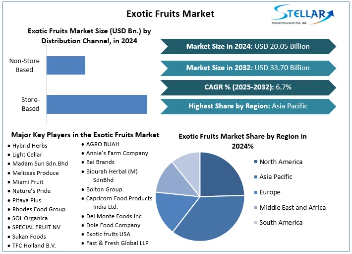 The exotic fruits market encompasses fresh or minimally processed fruit varieties that are not common in typical regional markets — such as dragon fruit, rambutan, durian, passion fruit and other tropical/sub-tropical fruits — valued for their unique tastes, vibrant colours, novelty and perceived health benefits. According to the report, the global exotic fruits market was valued at approximately USD 20.05 billion in 2024, and is projected to grow at a compound annual growth rate (CAGR) of about 6.7% from 2024 to 2032, reaching nearly USD 33.70 billion by 2032.