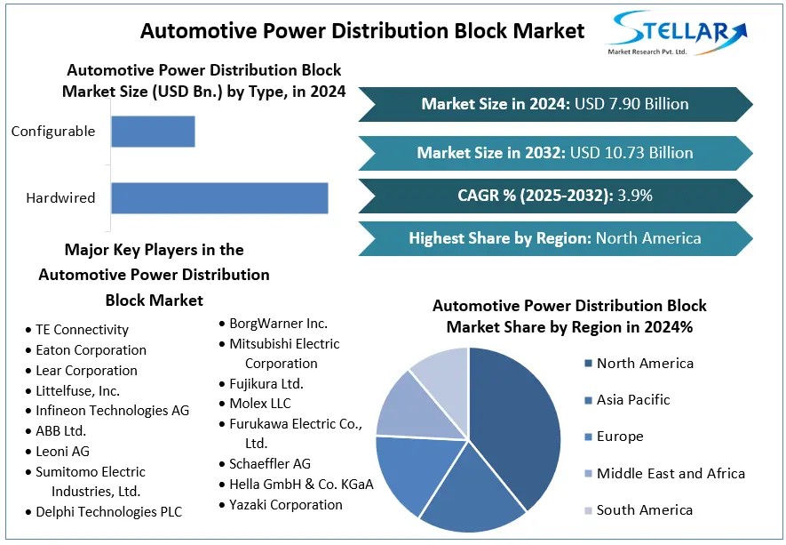 The global Automotive Power Distribution Block Market was valued at approximately USD 7.90 billion in 2024, and it is projected to reach around USD 10.73 billion by 2032, representing a compound annual growth rate (CAGR) of about 3.9% from 2025 to 2032.