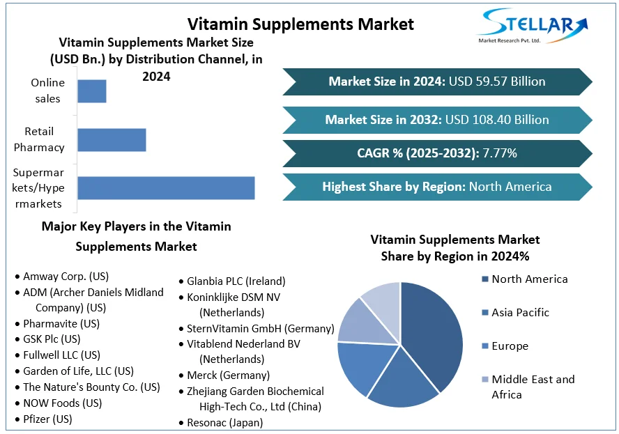 The Vitamin Supplements Market is experiencing robust growth worldwide, driven by increasing consumer focus on health, immunity, and preventive wellness. Vitamins—essential micronutrients required for proper metabolic and immune system functioning—are being consumed in supplement form due to changing diets, fast-paced lifestyles, and the growing prevalence of deficiencies.