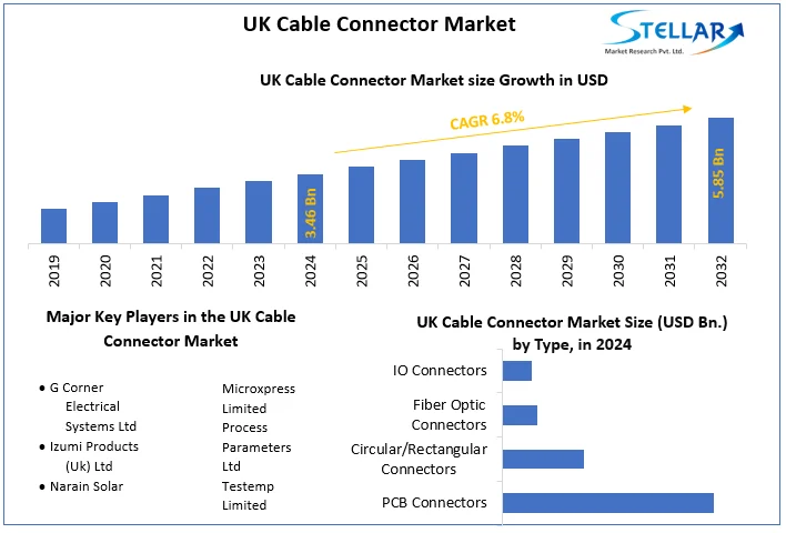 UK Cable Connector Market Size To Grow At A CAGR Of 6.8% In The Forecast Period Of 2025-2032 UK Cable Connector Market: Connectivity Underpins the UK’s Digital Backbone 1. Market Estimation & Definition The UK cable connector market was valued at US$ 3.46 billion in 2024 and is projected to grow to approximately US$ 5.85 billion by 2032, representing a compound annual growth rate (CAGR) of about 6.8% over the period 2025-2032. Cable connectors refer to mechanical and electrical devices used to join cables, assemblies, wires and related components, enabling transmission of power, data, signal or control. In the UK context this covers connectors used in fibre-optic networks, telecommunications, automotive wiring harnesses, power & signal cables in industrial settings, aerospace & defence, and consumer electronics. According to the findings, growth is being driven by increasing urbanisation, expansions in telecommunications networks, rising electronics use and adoption of automation across industries Request Free Sample Report:https://www.stellarmr.com/report/req_sample/UK-Cable-Connector-Market/117 2. Market Growth Drivers & Opportunities Several factors are fueling the UK cable connector market’s expansion and present clear opportunities: Telecommunications network expansion and data-infrastructure investment: The UK government’s drive toward gigabit broadband and full fibre deployments is boosting demand for fibre-optic cable connectors. The report notes that the fibre optics cable product segment is expected to grow at a high rate – a CAGR of 12.7% over the forecast period. Growth in consumer electronics and connected devices: As more homes adopt smart devices, IoT sensors, and home automation, the need for reliable cable connectors in routers, set-top boxes, gaming consoles and consumer electronics increases. Automotive electrification and wiring harness complexity: UK automotive is shifting toward advanced wiring architectures for EVs and ADAS systems; this drives Industrial automation, manufacturing and defence sectors: The UK has a strong manufacturing base and high-technology defence/aerospace industries that require precision connectors for harsh conditions, submarine/satellite systems and offshore infrastructure. The report mentions submarine/satellite connectors need to meet tough environmental demands. Urbanisation & infrastructural upgrades: As the UK invests in smart city infrastructure, data centres, 5G rollout and renewable energy installations, the underlying cable connector market indirectly benefits via higher volumes of cabling, signal and power systems. These drivers reflect both volume expansion (more units) and value growth (higher-performance connectors) — critical for suppliers seeking margin growth. In a world where connectivity is the backbone of commerce and infrastructure, cable connectors are the unsung enablers. The UK market offers several clear growth segments—particularly in telecom/fibre-optic, automotive wiring and industrial systems. Stakeholders who align with these growth areas, adopt advanced technologies, and emphasise innovation and service will capture the upside. While competitive pressures and cost dynamics remain, the overall trajectory is favourable — making the UK connector market an attractive space for investment, innovation and strategic growth. About us Phase 3,Navale IT Zone, S.No. 51/2A/2, Office No. 202, 2nd floor, Near, Navale Brg,Narhe, Pune, Maharashtra 411041 [email protected]