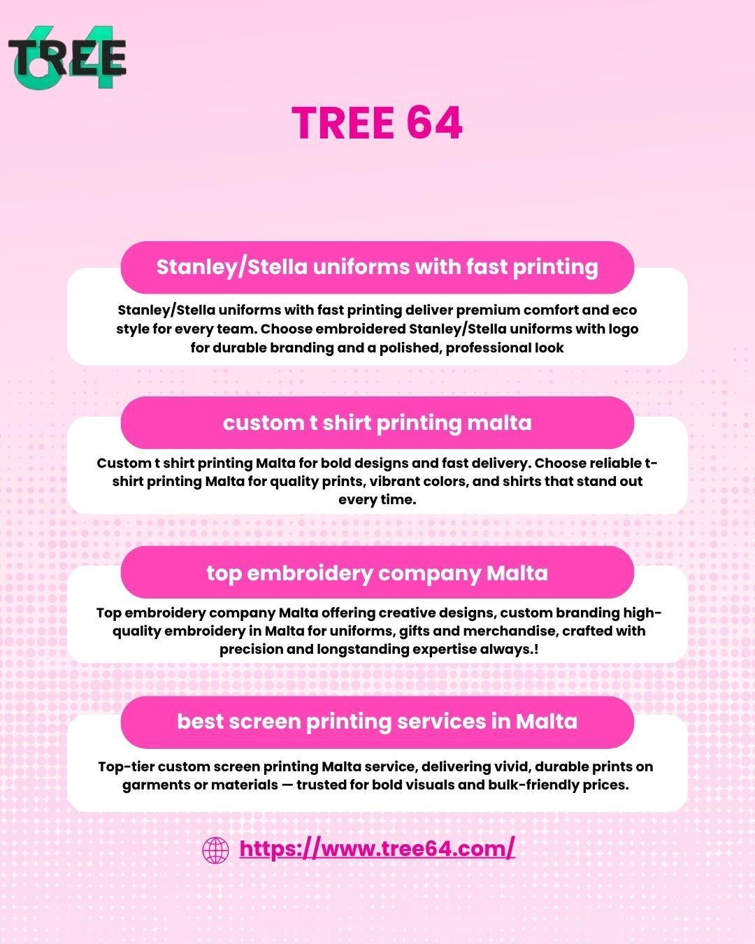 Tree 64 offers top-notch embroidery and screen printing in Malta, delivering durable, professional, and vibrant custom apparel for businesses and individuals.
